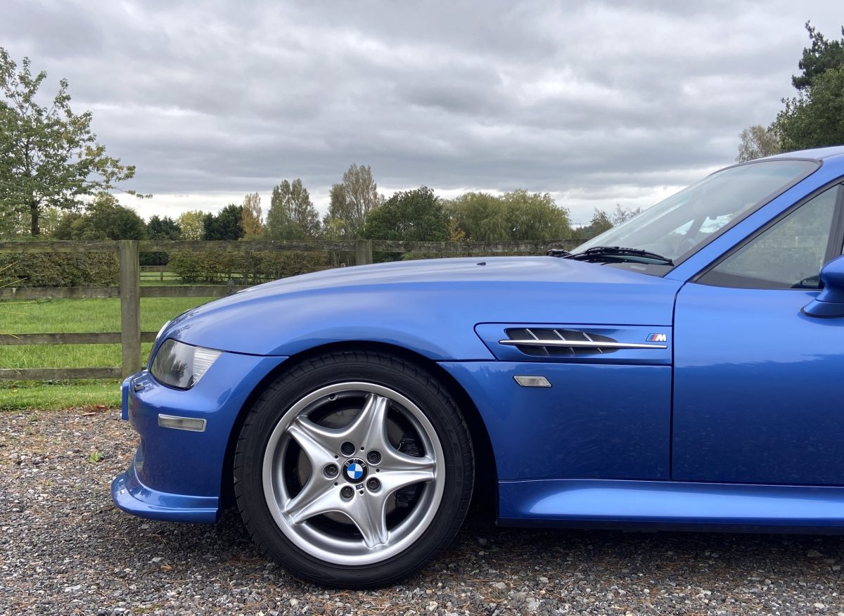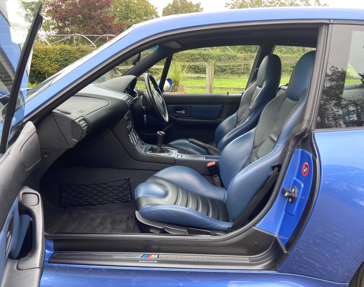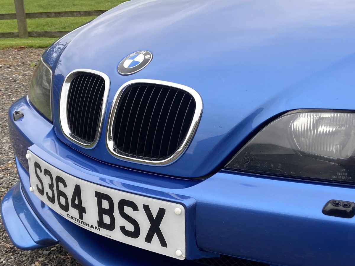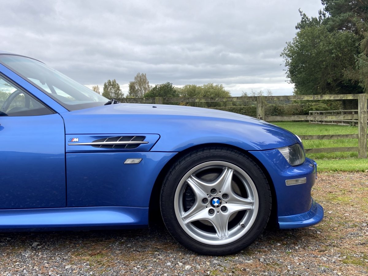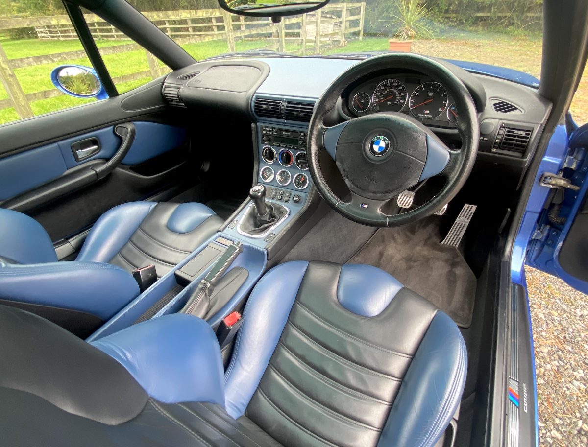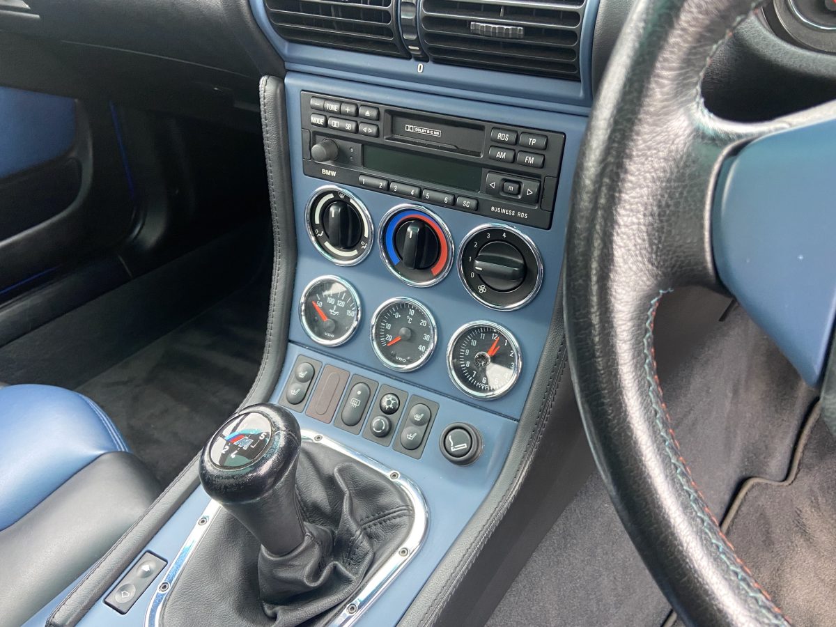 Supplied new by Menzies Motors of Stirling in Estoril Blue with a two-tone blue/black leather interior with a contrasting black headlining, this S50-engined Z3M was first registered on New Year’s Day in 1999.  In addition to the normal specification, it benefits from many options and a few upgrades including a Harman Kardon stereo with a multi-disc CD player, air-conditioning, M Sport steering wheel, electric glass tilt sunroof, electric front mirrors and windows, heated front seats and side airbags, internal net luggage guard, retractable load cover and the original toolkit remains in the boot.